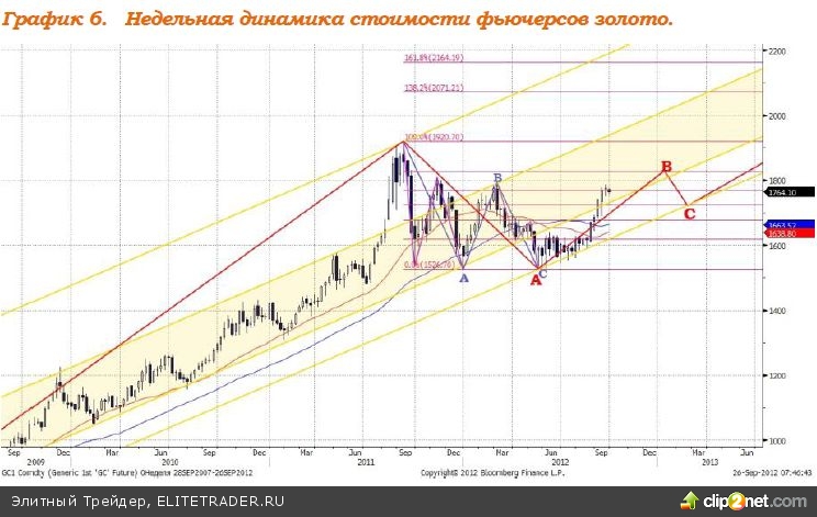 В настоящий момент формируется волна роста «В» в рамках «плоской коррекции» А-В-С. Коррекции предшествовала без малого трехлетняя фаза роста. Вполне логично, что период компенсации роста предположительно будет длиться порядка полутора лет и, по нашим расчетам, завершится в первом квартале 2013 года, после чего начнет формироваться следующая волна подъема котировок. Текущая волна «В» в рамках коррекционного движения направлена вверх, целью, по нашим прикидкам, служит отметка $1830. После чего может последовать волна «С» - цель $1720; на этом «плоская коррекция», по нашему мнению, будет реализована, далее стартует фаза роста.