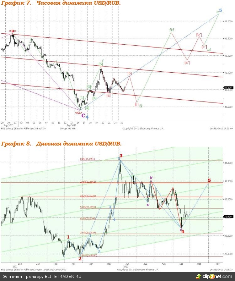 Валютная пара доллар/рубль в настоящий момент формирует нисходящую волну в восходящей iiволне 5, см график 7. Сегодня ожидаем роста котировок пары до уровня 31,38. Предполагаемая структура динамики соотношения доллара США и российской валюты в среднесрочной перспективе изображена на графиках 7 и 8.