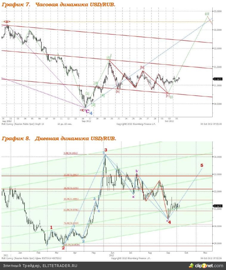 Валютная пара доллар/рубль в настоящее время близка к завершению формирования коррекционной волны ii в восходящем импульсе, волне 5, см график 7. Соотношение доллара и рубля в ходе сегодняшней торговой будет находиться в диапазоне значений 31 - 31,25. Предполагаемая структура динамики соотношения доллара США и российской валюты в среднесрочной перспективе изображена на графиках 7 и 8.