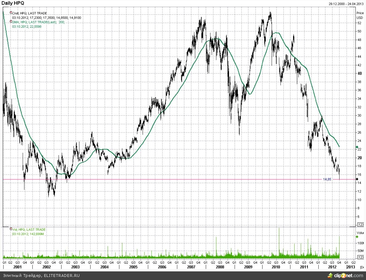 Индекс широкого рынка S&P500 продолжает упорно удерживаться за двухмесячный восходящий тренд, скромными шагами продвигаясь в направлении сентябрьских максимумов. Несколько хуже выглядит динамика индекса голубых фишек - Dow Jones, давление на который вчера оказал обвал в акциях одного из крупнейших поставщиков аппаратного и программного обеспечения Hewlett-Packard, чьи бумаги подешевели почти на 13% после того как руководство компании понизило оценки по прибыли на 2013 финансовый год с $4,06 до $3,40-$3,60 на акцию по non-GAAP и до $2,10-$2,30 на акцию по GAAP. Прогнозы Wall Street по показателю, не включающему расходы на реструктуризацию, уплату налогов в размере около $1,30 на акцию, были на уровне $4,18. Цена на акции HP в среду обновила минимумы за девять лет, опустившись к отметке $14,85 за акцию, и если здесь говорить об отскоке, его вероятной целью будет выступать минимум 2011 года в районе $22.