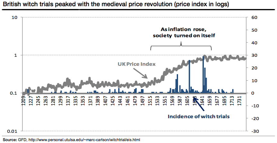 Но эти социальные потрясения, произошедшие на фоне экономических неурядиц, хорошо известны. Гораздо менее известны костры инквизиции в Британии в конце XVI — начале XVII веков – когда на фоне гиперинфляции стали сжигать ведьм.
