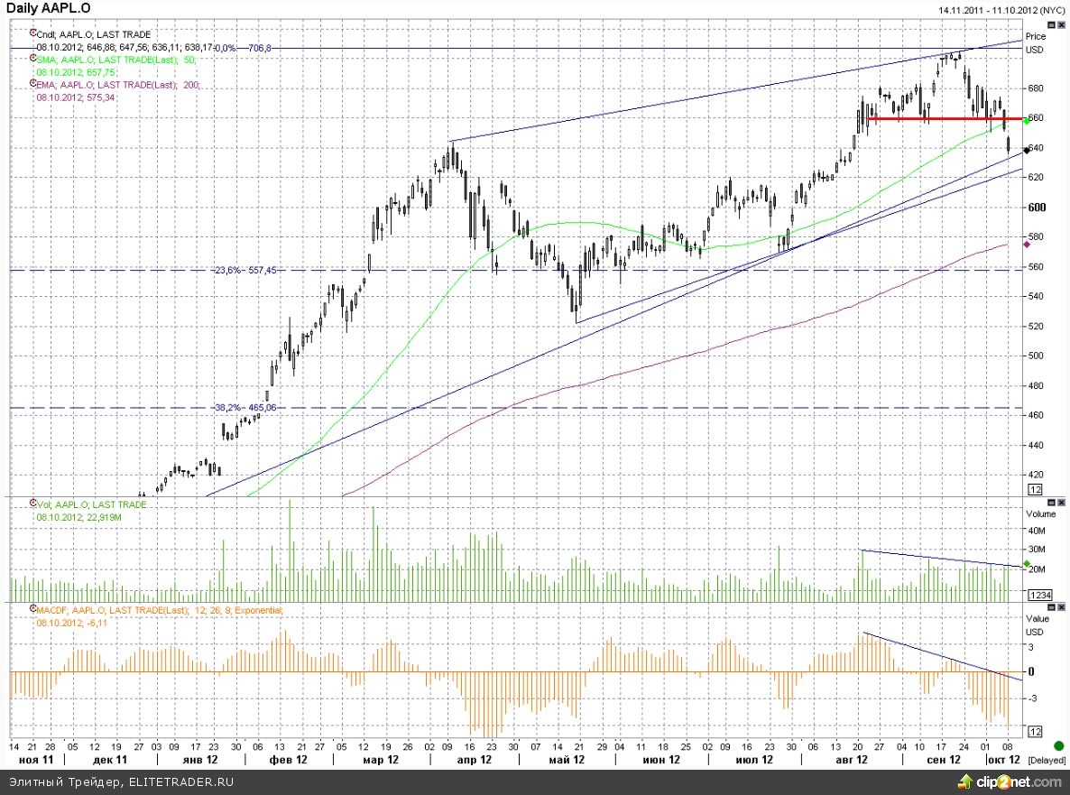 С точки зрения техники, ранее мы выделяли, тревожные сигналы в динамике котировок акций Apple, которые частично уже нашли свое подтверждение. Дневной график подсказывает, что на данный момент в бумаге проходит реализация потенциала разворотной фигуры «голова-плечи» с целью в район $615-$620, то есть годовому восходящему тренду. Медвежьи сигналы на более старших таймфреймах, свидетельствуют о том, что снижение не ограничится даже данными рубежами и может проходить вплоть до первого коррекционного уровня по Фибоначчи (23,6%) к восходящей волне от кризисных минимумов, то есть до отметки $560.