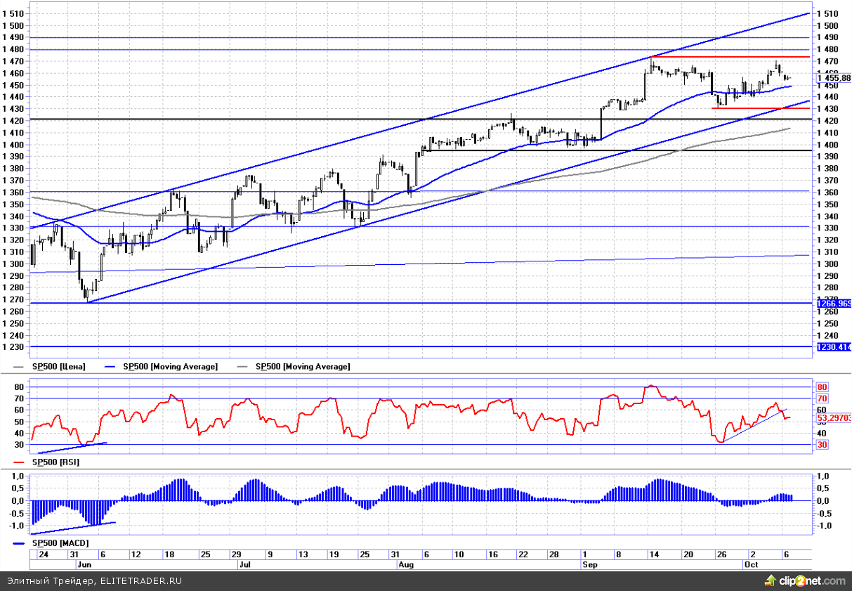 Вследствие того, что в США вчера праздновался День Колумба, активность на торгах была несколько ниже среднего. Общая техническая ситуация изменилась совсем немного, медведи лишь на один шаг приблизились к тому, чтобы начать реализацию разворотной формации «двойная вершина». Тем не менее, до полноценной отработки данной фигуры продавцам необходимо еще немало пройти. Точка отмены сценария роста в данный момент проходит лишь на уровне 1430-1435п. (здесь также лежит и нижняя граница up-тренда). Только после закрепления индекса под этим рубежом будет иметь смысл говорить о начале полноценной нисходящей тенденции с самой первой целью на 1390п.
