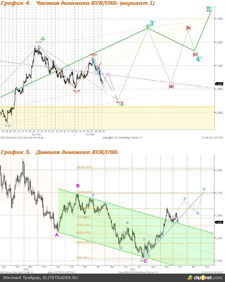 В связи с более глубокой просадкой значения валютной пары евро/доллар, чем ожидали ранее, мы пересмотрели технический взгляд на соотношение единой европейской валюты и доллара. Пересмотр коснулся формы и глубины проседания в рамках коррекционной волны -4-. Раннее полагали, что коррекционная волна -4- будет плоской (окончание уровень 1,2910), однако, по указанной выше причине считаем, что упомянутая волна будет выполнена в форме зигзага, конечной целью волны является уровень 1,27 - 1,2710. Валютная пара евро/доллар в настоящее время продолжает формировать зигзагообразную коррекционную волну -4-. В моменте формируется волна =c=. Полагаем, сегодня соотношение евро и американской валюты вырастет до уровня 1,29 -1,2910. Предполагаемая структура движения котировок евро/доллара изображена на графиках 4 и 5.