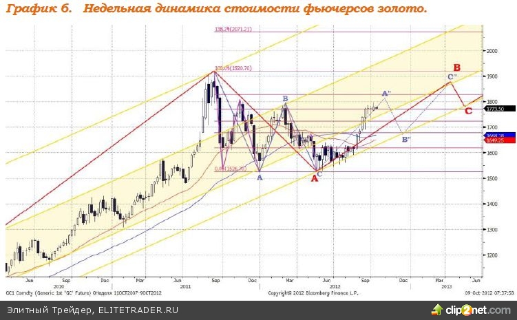 В настоящий момент формируется волна роста «В» в рамках «плоской коррекции» А-В-С. Коррекции предшествовала без малого трехлетняя фаза роста. Вполне логично, что период компенсации роста предположительно будет длиться порядка полутора лет и, по нашим расчетам, завершится в первом квартале 2013 года, после чего начнет формироваться следующая волна подъема котировок. Текущая волна «В» в рамках коррекционного движения направлена вверх, целью, по нашим прикидкам, служит отметка $1880. После чего может последовать волна «С» - цель $1780; на этом «плоская коррекция», по нашему мнению, будет реализована, далее стартует фаза роста