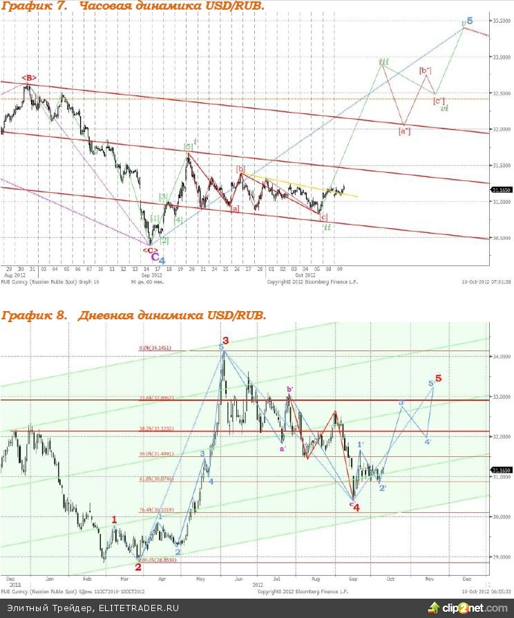 Валютная пара доллар/рубль в настоящее время находится в рамках восходящего импульса - в волне 5, см график 7. Учитывая укрепление доллара, которое произошло сегодня ночью, торги парой доллар/рубль стартуют на отметке 31,20. В дальнейшем, в течение дня мы ожидаем ослабления американской валюты, роста стоимости нефти, что станет драйвером укрепления рубля. Полагаем сегодня, в ходе торгов соотношение доллара и российской валюты снизится к отметке 31,10 рубля за $1. Предполагаемая структура динамики соотношения доллара США и российской валюты в среднесрочной перспективе изображена на графиках 7 и 8