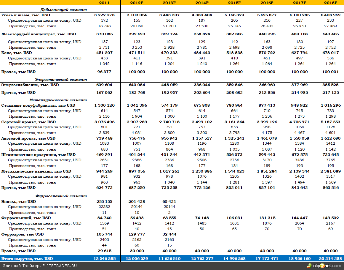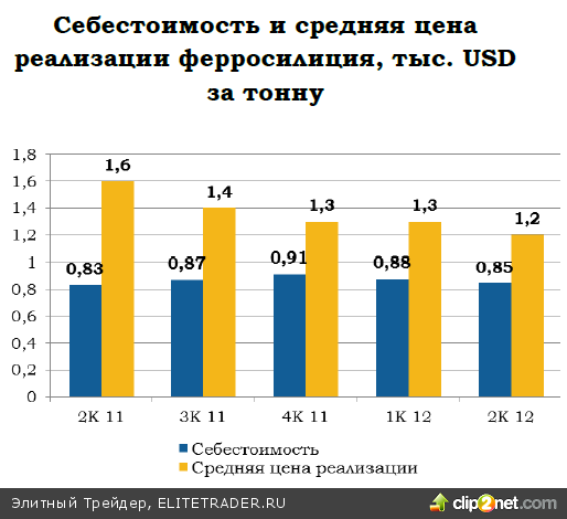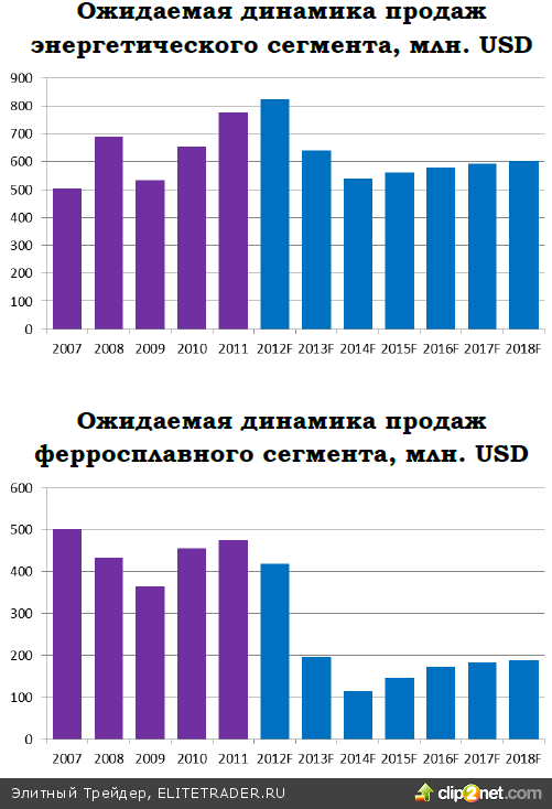 В ферросплавном сегменте ожидаем падения выручки в текущем году порядка 12%. После того как будут проданы основные активы, останется только производство ферросилиция. Выручка сегмента упадет в 3-4 раза за 2013 – 2014 гг., после чего может показать неплохой рост.