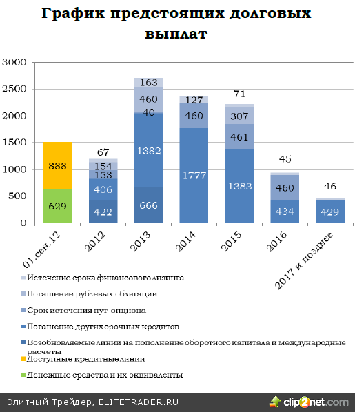 Фактически сейчас можно с уверенностью сказать, что дефолт в текущем году «Мечелу» не угрожает – краткосрочная задолженность, которую необходимо погасить до конца года, на начало сентября полностью покрывается кэшем и невыбранными лимитами по кредитным линиям. До конца года нужно погасить только $1,2 млрд., тогда как на рынке до сих пор ходит поверье о жизненно необходимых «Мечелу» «двух миллиардах». При этом на начало сентября лимит по кредитным линиям и кэш в сумме превышают $1,5 млрд.