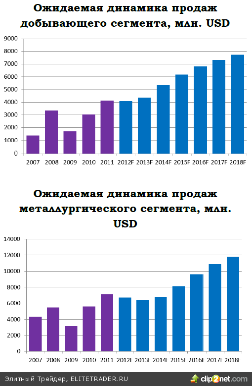 В металлургическом сегменте ожидаем снижения выручки порядка 6,5%. В 2013 году также ожидаем отрицательную динамику выручки из-за слабого восстановления рынка стали и продажи части производственных мощностей. Далее ожидаем восстановления выручки сегмента вместе с рынком.