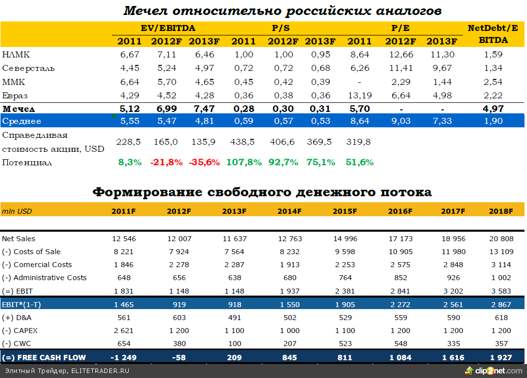 При этом мы осуществляем оценку на конец 2013 года. Мы рассчитываем, что к этому времени Мечел реализует большую часть активов. Это позволит сократить чистый долг до $5,4 млрд. и стоимость заимствований для Мечела до 8,5%.