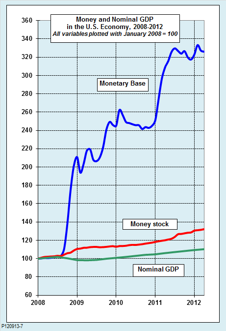 Как кандидат в вице-президенты США республиканец Пол Райан победил демократа Джо Байдена на дебатах (ВИДЕО) Сейчас лучшее, что может сделать Бернанке – просто заткнуться, считает Ecomonitor. Глава ФРС бесконечно говорит о том, как хороша его программа QE. И пытается убедить всех, что у ФРС достаточно инструментов, чтобы справиться с инфляцией, риск которой очень велик. А правда в том, что у ФРС нет реальной стратегии выхода. Расчет на экономический рост пока себя не оправдывает. Достаточно посмотреть на график: номинальный ВВП едва шевелится, несмотря на огромные скачки денежной базы.