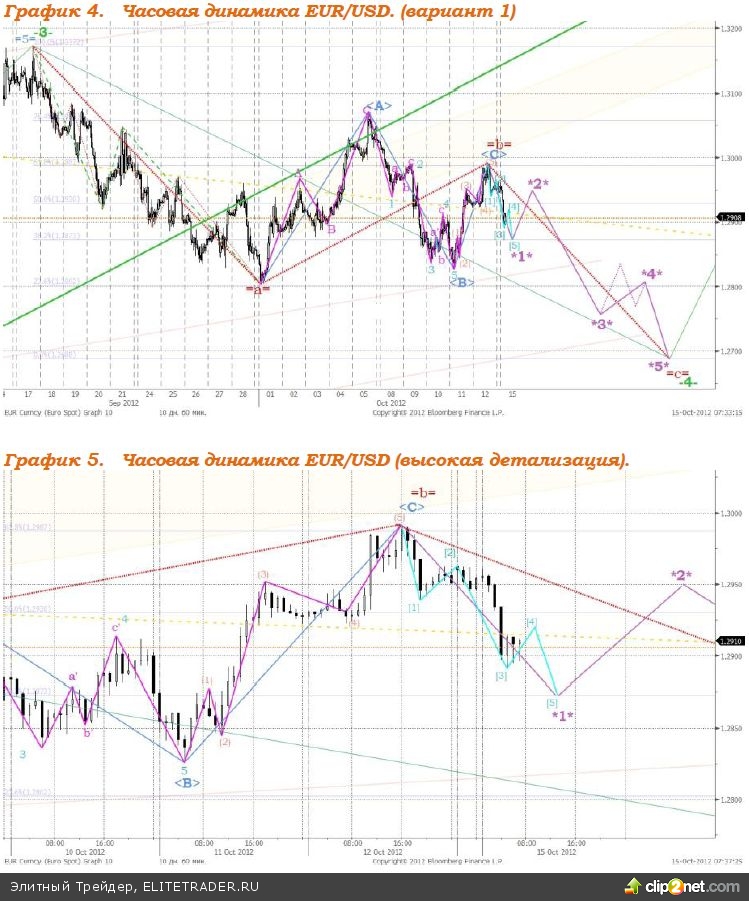 Валютная пара евро/доллар в настоящее время продолжает формирует зигзагообразную (=a=, =b=, =c=) коррекционную волну -4-, которая направлена вниз. Целью волны -4- является отметка 1,2688. Полагаем, сегодня пара будет консолидироваться и покажет незначительный рост к уровню 1,2920 - 1,2925. Завтра- послезавтра снижение может продолжиться, в ходе которого значение соотношения евро и доллара достигнет отметки 1,2872. Предполагаемая структура движения котировок евро/доллара изображена на графиках 4 и 5.