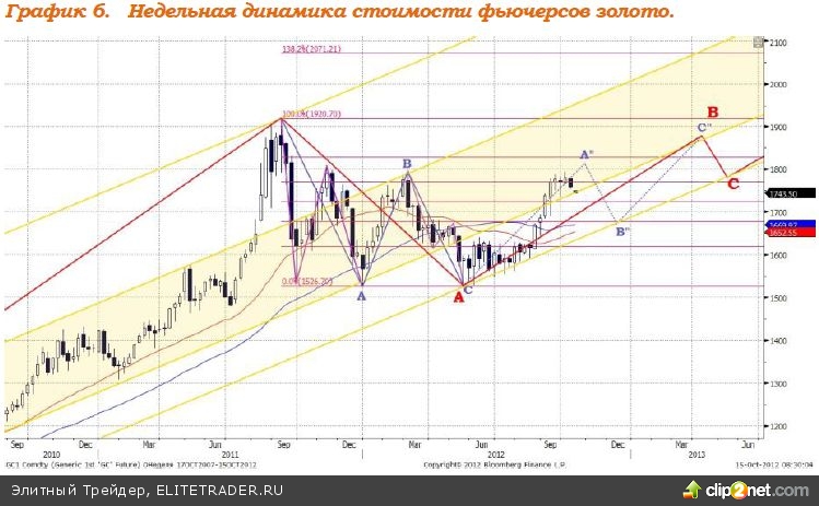 В настоящий момент формируется волна роста «В» в рамках «плоской коррекции» А-В-С. Коррекции предшествовала без малого трехлетняя фаза роста. Вполне логично, что период компенсации роста предположительно будет длиться порядка полутора лет и, по нашим расчетам, завершится в первом квартале 2013 года, после чего начнет формироваться следующая волна подъема котировок. Текущая волна «В» в рамках коррекционного движения направлена вверх, целью, по нашим прикидкам, служит отметка $1880. После чего может последовать волна «С» - цель $1780; на этом «плоская коррекция», по нашему мнению, будет реализована, далее стартует фаза роста