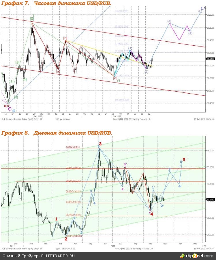 Валютная пара доллар/рубль в настоящее время находится в рамках восходящего импульса - , см график 7. В настоящее время закончила формирование нисходящая волна и начинает развиваться восходящая волна . Ориентиром роста в рамках волны служит отметка 31,67. Сегодняшние торги парой стартуют с уровня 31,20 рубля за $1. В ходе торговой сессии соотношение доллара и рубля будет стремиться к уровню 31,10 рубля за $1. По достижении уровня 31,10 значение пары вновь продолжит свой рост, в течение следующих одного-двух дней соотношение доллара рубля достигнет значения 31,30. Предполагаемая структура динамики соотношения доллара США и российской валюты в среднесрочной перспективе изображена на графиках 7 и 8.