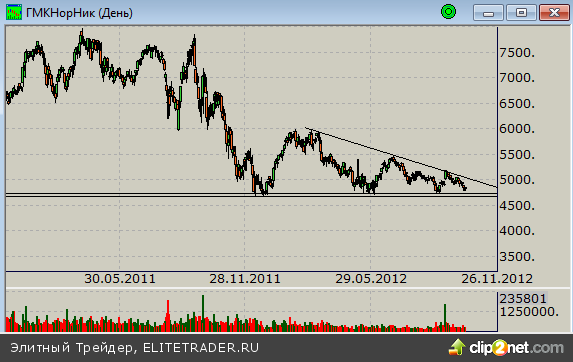 Продолжается консолидация цен в рамках сужающегося диапазона торгов. В рамках данной формации котировки пробили локальную поддержку, которой выступала отметка 4900 рублей, что стало причиной их движения в район минимумов года. Отметка 4900 теперь будет выступать локальной преградой при формировании отскока. Ждем выхода котировок из сложившейся формации.
