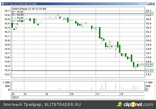 Фьючерсы на сахар находятся под давлением в связи с ожиданиями перепроизводства этого продукта на мировом рынке в текущем сельскохозяйственном году. По некоторым оценкам, производство сахара в России в 2012-2013 г. может достигнуть рекордных объемов. Техническая картина говорит в пользу дальнейшей консолидации этих контрактов в широком диапазоне, ограниченном отметками 14.00 – 15.65 рублей.