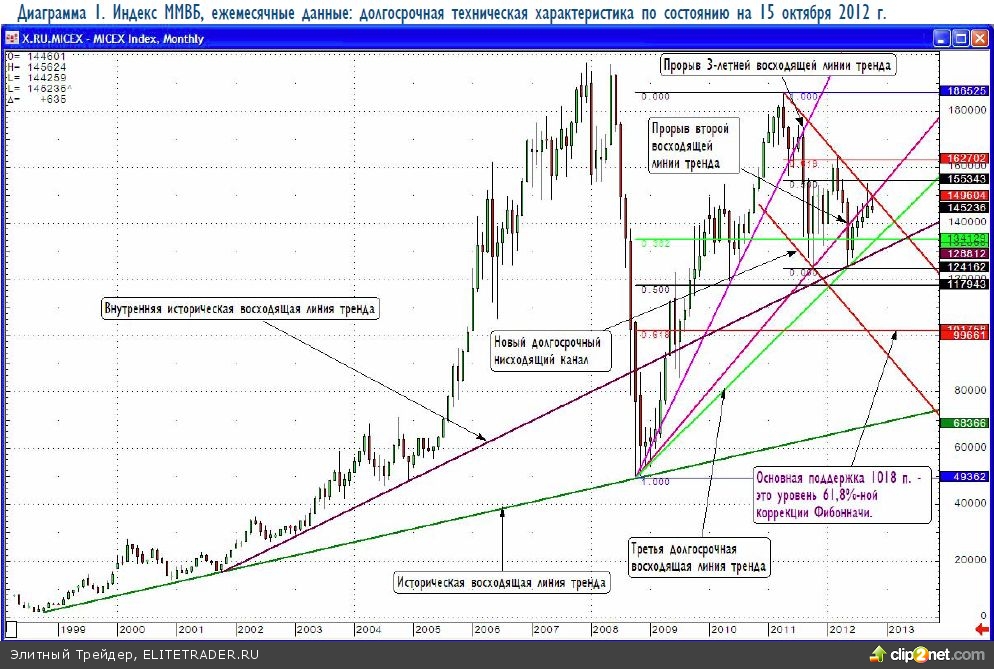 Как показано на Диаграмме 1, прорыв 3-летней восходящей линии тренда в августе 2011 г. привел к перелому долгосрочного «бычьего» тренда на российском рынке акций. Начиная с марта 2012 г. индекс ММВБ стал двигаться в границах нового долгосрочного нисходящего канала. В мае 2012 г. была прорвана (сверху вниз) вторая долгосрочная восходящая линия тренда. Следует отметить, что минимум мая 2012 г., равный 1241,62 п., совпадает со значением внутренней исторической восходящей линии тренда на тот момент. С тех пор вот уже пятый месяц индекс ММВБ «ползёт» наверх, безуспешно пытаясь прорвать эту линию тренда. Все заскоки выше нее немедленно продаются.