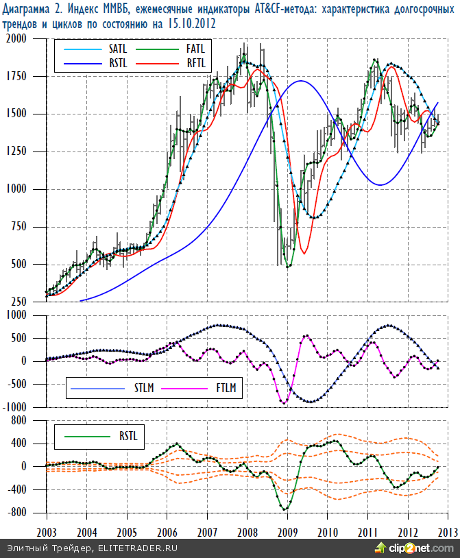 Долгосрочный тренд в индексе ММВБ является понижательным, начиная с сентября 2012 г., после кроссинга (сверху вниз) индикаторов SATL и RSTL в верхней части Диаграммы 2. В то же время господствующий на рынке среднесрочный тренд (см. индикатор FATL в верхней части Диаграммы 2) пока остаётся «бычьим», что сдерживает индекс от ускоренного падения. Текущее состояние долгосрочного тренда очень похоже на состояние этого тренда в 2008 году. Отличие заключается лишь в том, что индикаторы FATL и составной волновой цикл (индикатор RBCI в нижней части Диаграммы 2) пока находятся в фазе роста. Однако как только индикаторы FATL и RBCI возобновят снижение в тандеме с медленной адаптивной линией тренда SATL, падение индекса может резко ускориться