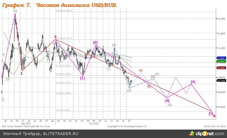 В связи с резким ослабление доллара и ростом стоимости нефти мы пересмотрели прогноз динамики валютной пары доллар/рубль. Пара в настоящее время формирует пятиволновый импульс 3 ([1] - [5]) направленный вниз. Целью Волны 3 служит отметка 30,3365 рубля за $1. В настоящее время формируется плоская коррекция – подволна {4}, по этой причине соотношение доллара и рубля будет находиться в ближайшие дни в диапазоне значений 30,70 – 30,90. Предполагаемая структура динамики соотношения доллара США и российской валюты в среднесрочной перспективе изображена на графиках 7 и 8