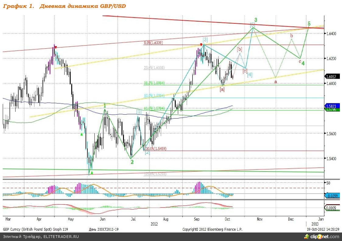 Полагаем, высока вероятность того, что окончание волн 3 и 5 придется на один уровень (1,6440), т.к. на этом уровне проходит сильное сопротивление, которое построено по максимальным значениям 2009 и 2011 годов. Однако существует вероятность преодоления этого уровня и роста соотношение британской валюты и доллара вплоть до значения 1,6700.