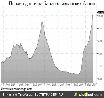 Для борьбы с плохими долгами Испания собирается до конца года создать действительно эффективное, как представляется на основе опыта «репетиции» кризиса 2008 г. – кризиса S&L середины 1980-х гг. в США, средство: bad bank, что, однако, подразумевает некоторые расходы. Так, предельные активы такого банка установлены в размере 90 млрд.евро, однако предполагается, что конечный размер будет всего-то 60- 70 млрд., при условии haircut на выкупаемые плохие активы от 54 до 60%. Цены на активы будут установлены независимым аудитором (это Oliver Wyman), а банк должен начать работать до Нового года. Зная склонность официальных лиц ЕС при прогнозировании ситуации обильно сластить пилюлю, стоит, пожалуй, ожидать со временем новых сюрпризов. Например, не очень ясно, как будут сопрягаться испанский bad bank и программа прямой рекапитализации банков Испании со стороны ESM, о которую и ломаются ныне копья. Хотя сама по себе идея bad bank’а неплоха, как сучит история кризиса S&L – по крайней мере, балансы банков могут быть расчищены по-настоящему и по «мягкому» варианту.