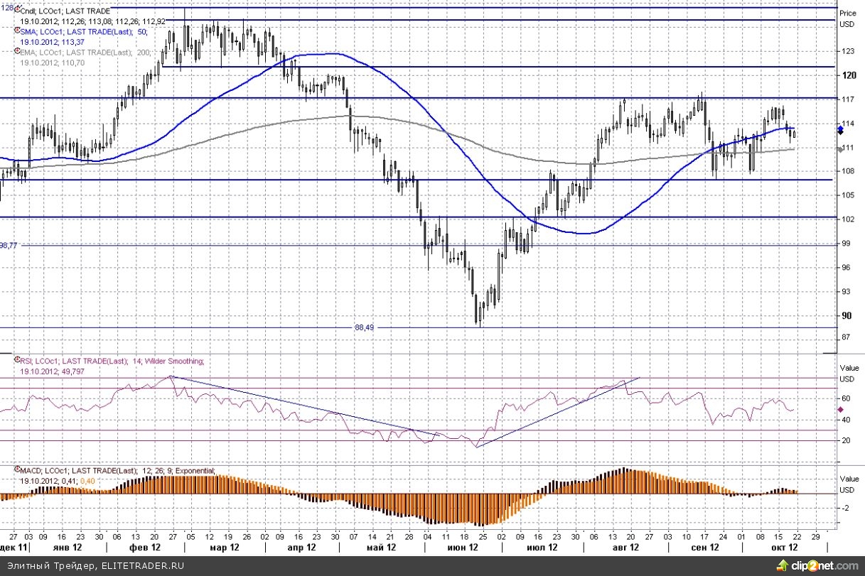 Что касается технической картины, то в целом ничего интересного не происходит. Как уже много раз отмечалось, котировки Brent все также находятся в рамках широкого диапазона консолидации, четкого тренда не наблюдается. О какой-то более четкой среднесрочной тенденции можно будет говорить лишь после выхода из бокового диапазона $107-117.