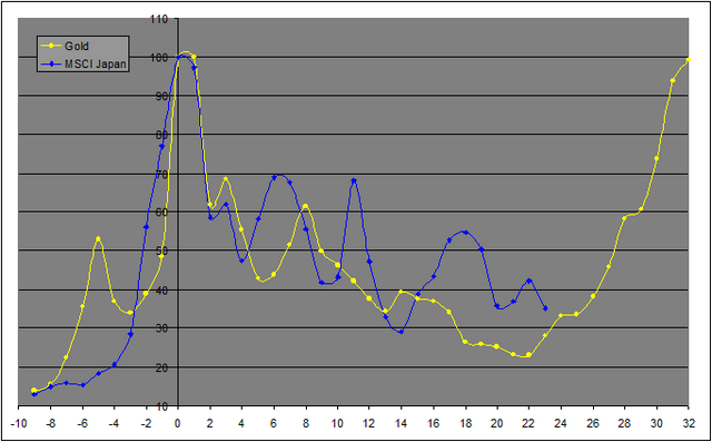 На сегодняшний момент, если взять общий рыночный консенсус относительно перспектив вложения денег в различные активы, рынок акций Японии и золото окажутся на диаметрально противоположных с точки зрения предпочтений долгосрочных инвесторов полюсах. Именно поэтому мне интересно сравнить динамику цен указанных активов до момента достижения пика пузыря и после того, как он начал сдуваться.