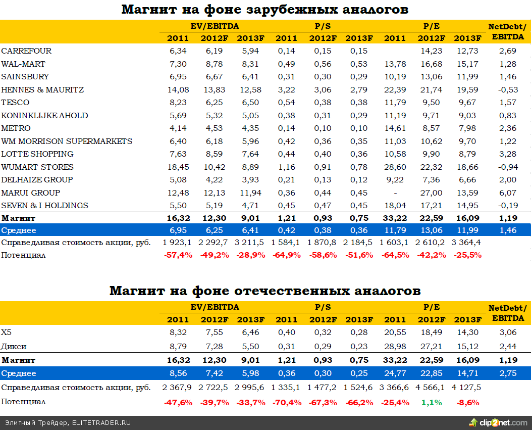 И в то же время, акции Магнита выглядят очень дорого на фоне других ритейлеров. При сравнении с зарубежными аналогами это отчасти оправдывается высокими темпами роста сети и относительно низкой долговой нагрузкой. Премия к основным конкурентам – Х5 и Дикси – отчасти объясняется долговой нагрузкой. Но в целом, уровни, на которых бумаги находятся, выглядят очень высокими, и явной недооценки не демонстрируют.