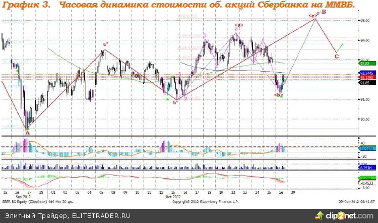 Также как и в случае с Индексом ММВБ, в обыкновенных акциях Сбербанка индикатор, основанный на динамике ADX, а также MACD консолидировано сформировали сигнал к росту. При этом, на часовом графике, был сформирован, так называемый, фрактал, который указывает на смену тенденции. Исходя из чего можно предположить – минимальное значение 91,36 обновлено не будет, стоимость акций банка в рамках волны