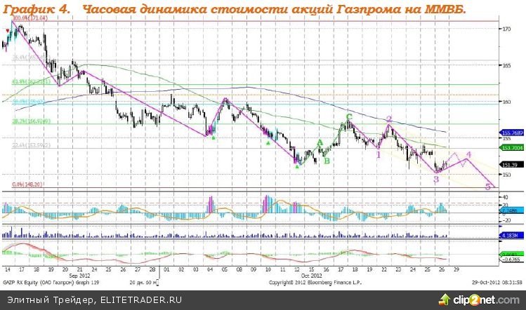 Ранее мы предполагали, сто акции Газпрома могут просесть вплоть до уровня 140 рублей. Однако, в связи с высоким уровнем роста экономики США в третьем квартале, мы пересмотрели глубину проседания стоимости акций компании до 148,20 рубля за акцию. Сегодня ждем роста стоимости акций Газпрома к отметке 153 рубля, после чего в рамках волны 5 снижение возобновиться. Поддержка на уровне 151.50; 150.74. Сопротивление – 153.00, 153.70, 155.75, 157.00, 160