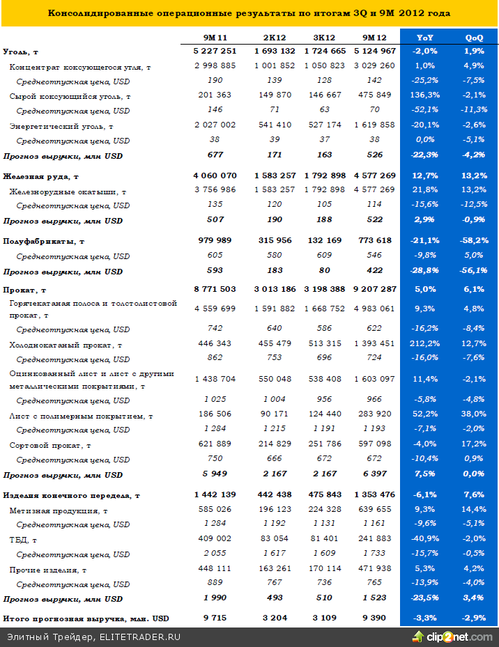 Железорудный сегмент по-прежнему выглядит достаточно сильно. Продажи выросли почти на 13% по сравнению с 2К12. Однако снижение цен затронуло и железорудное сырье, поэтому в 3К12 финансовые показатели сегмента будут под давлением. Выручка сегмента может снизиться на 1%, рентабельность на уровне EBITDA также будет под давлением.