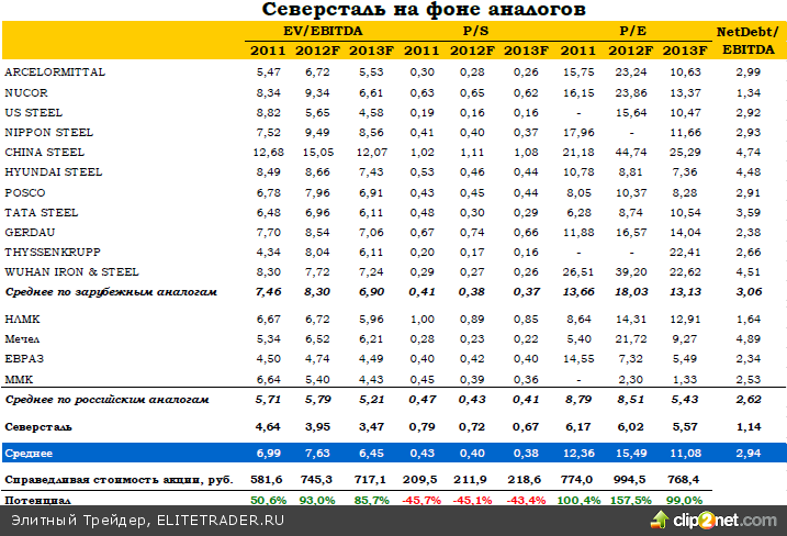 В итоге, финансовые результаты 3К12 не должны быть хуже, чем в прошлом квартале, несмотря на продолжающееся снижение цен на продукцию, и в целом будут лучше, чем у других предприятий отрасли. Ожидаем, что Северсталь сохранит лидерство по рентабельности. При этом наши годовые прогнозы выглядят несколько излишне оптимистичными из-за крайне неблагоприятной ценовой конъюнктуры на рынках проката и сырья.