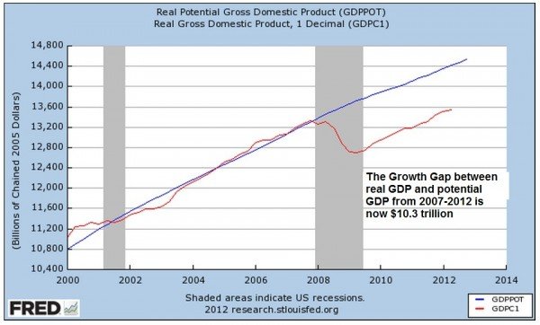 Правительства Евросоюза на этой неделе обсудят сокращение долгосрочного бюджета по меньшей мере на 50 млрд евро. Не все радуются росту экономики США за III квартал на 2% - немного выше ожиданий аналитиков. Обозреватель American Enterprise указывает, что если бы восстановление страны от кризиса шло более быстрыми темпами, то совокупный ВВП за последние 5 лет был бы на $10,2 трлн выше. С июля по октябрь экономика выросла всего на 2%, за год ожидается рост в 1,8%. На самом деле потенциал у нее выше, но снижение доходов и высокий уровень безработицы приводит разрыву между фактическим и потенциальным объемом производства, что видно на графике. Поскольку экономика замедляется, люди теряют доверие и вообще перестают тратить, еще больше замедляя рост. А ожидать улучшения в преддверии «Финансовой скалы» (Fiscal Cliff) вообще бессмысленно.