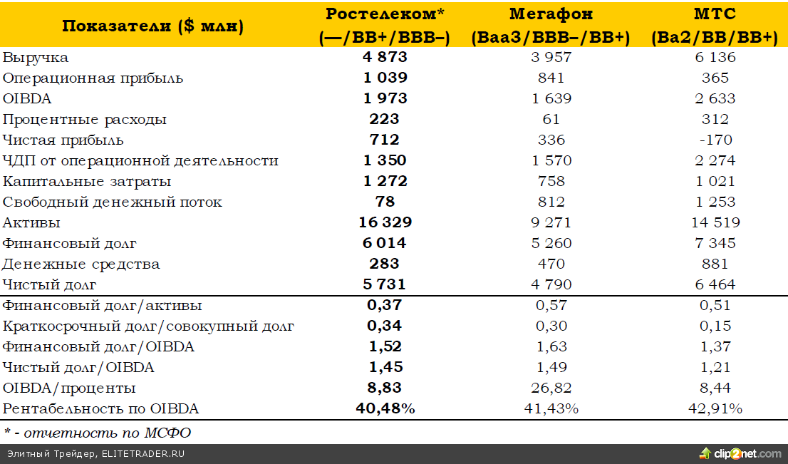 По масштабам бизнеса Ростелеком немного выше МТС и значительно превосходит Мегафон. При этом свободный денежный поток оператора хотя и положительный, но существенно уступает как МТС, так и Мегафону. Показатели долговой нагрузки Ростелекома выше, чем у МТС, но ниже, чем у Мегафона. Так, у Ростелекома соотношение Финансовый долг/OIBDA по итогам 1П12 года находилось на уровне 1,5х, Чистый долг/OIBDA — 1,45х.