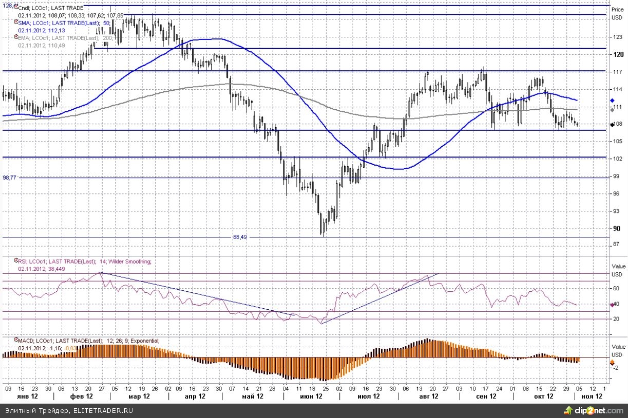 Что касается общей технической ситуации, то здесь существенных изменений в последние дни не происходит. Цена на Brent продолжает оставаться в рамках своего широкого среднесрочного бокового диапазона. В данный момент котировки находятся вблизи нижнего рубежа поддержки $107. О новой направленной тенденции будет иметь смысл говорить лишь в случае окончательного выхода и закрепления за пределами существующего коридора консолидации ($107-117). При развитии медвежьего сценария и прохода нижней границы следующей остановкой выступит область в $104-103 за баррель.