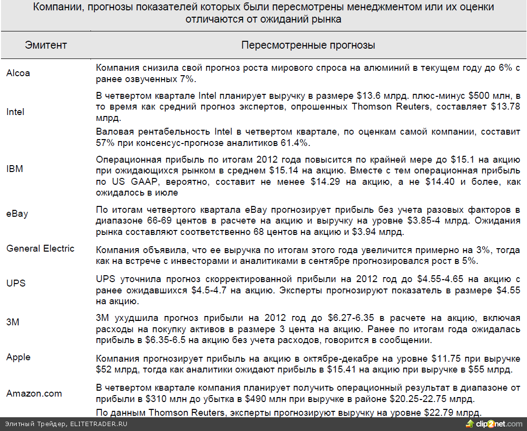 Традиционно к сезону отчетности в США повышенное внимание. Состояние корпоративного сектора в стране - важный индикатор положения дел не только в экономике Штатов, но и мира в целом, т.к. многие компании списка S&P 500 глобальные и имеют бизнес по всему миру. Результаты за 3 кв. 2012 г. интересны еще и тем, что впервые за 11 кварталов аналитики прогнозировали снижение прибыли на акцию эмитентов входящих в индекс S&P 500 (на 1.5%). Пока эти ожидания не оправдываются: суммарная прибыль уже отчитавшихся компаний снизилась относительно 2 кв. 2012 г. на 0.3%. При этом на текущий момент из 233 уже отчитавшихся эмитентов (56% от капитализации индекса S&P 500) лучше ожиданий прибыль показали 114 компаний (29% от капитализации), а по выручке прогноз превзошли 108 компаний (27% от капитализации). Если результаты за 3 кв. 2012 г. в целом не вызывают особых негативных эмоций у инвесторов, то вот прогнозы, которые дают эмитенты на 4 кв. 2012 г. менее оптимистичны. Многие компании пересматривают ожидания по финансовым и производственным показателям на последний квартал года или дают оценки, которые ниже рыночного консенсуса. Надо отметить, что в их числе достаточно крупные корпорации такие, как Apple, Alcoa, Intel, IBM, General Electric. Основным поводом для пессимистических оценок являются ожидания падения спроса со стороны Европы и Азии. Не исключено, что такие опасения вызваны и внутренними факторами, а именно fiscal cliff, в случае реализации которого налоговое бремя на корпорации может возрасти, а госзаказы сократятся. В тоже время, несмотря на ухудшение прогнозов, ожидания по динамике прибыли остаются позитивными: по итогам 4 кв. 2012 г. ожидается рост выручки компаний, входящих в индекс S&P 500, на 2.2%, а прибыли - на 5.5%.