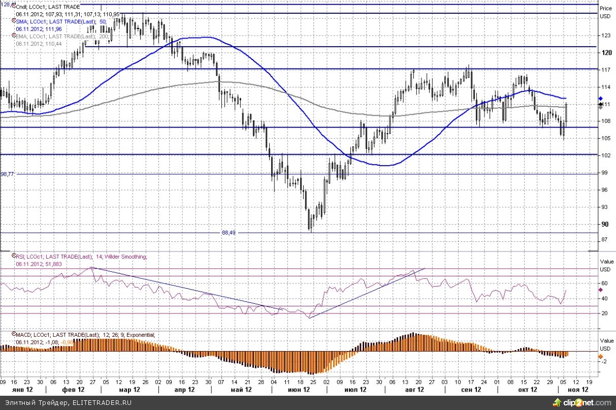 Барак Обама был переизбран на свой второй срок президенства. Рынки ожидают продолжения текущей стимулирующей политики, дешевого доллара, и роста цен ан рисковые активы: акции, нефть, металлы.