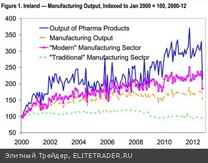 А знаете ли вы, что над Ирландией нависает свой «обрыв»? В сентябре объем промышленного производства в стране резко упал на 12.7% по отношению к предыдущему месяцу. Однако этот показатель не будет казаться значительным, если посмотреть на производство фармацевтических продуктов и препаратов – их производство рухнуло на 35.2% в прошлом месяце, продемонстрировав самое большое падение с февраля 2006 года. Это можно назвать «патентным обрывом» - тенденцией, когда ведущие производители лекарств теряют патентную защиту, что приводит к снижению цен и сокращению экспорта. По словам Дана О’Брайана из Irish Times, в прошлом году фармацевтический и химический секторы сгенерировали экспортную прибыль в размере 56 млрд евро – это на 40% больше, чем в последние пять лет. Однако рост может быстро закончиться, так как истекает срок действия многих патентов на популярные препараты, продающиеся в Ирландии. Financial Times