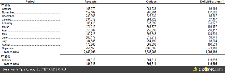 Между тем, по данным американского Казначейства дефицит федерального бюджета США в октябре 2012 года или первом месяце нового финансового года составил $120 млрд. против $98 млрд. за аналогичный период прошлого года и ожидавшихся $113млрд., притом, что правительство ожидает в этом году сокращения дефицита до $990,6 млрд. Рост дефицита главным образом обусловлен увеличением расходов с 261,5 до $304 млрд., в частности в разрезе отдельных министерств на $23 млрд. выросли расходы Министерства здравоохранения и социальных служб до $76,3 млрд.