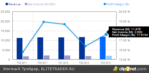 Были в IT-секторе и позитивные истории, если можно так сказать, учитывая результаты торгов на постмаркете, на которых в частности капитализация крупнейшего производителя сетевого оборудования Cisco Systems, Inc. выросла на 7,5% после публикации квартальной отчетности. Компания приятно удивила аналитиков как показателями прибыли, так и выручки. По GAAP чистая прибыль выросла на 18% в годовом выражении до $2,1 млрд. В расчете на акцию скорректированная чистая прибыль составила 48 центов против ожидавшихся 46. Выручка превысила $11,87 млрд. при прогнозе на уровне $11,77 млрд. "Мы достигли рекордных результатов в этом квартале - с ростом выручки на 6% и высокой прибыли на акцию - рост демонстрирует, что наше видение и стратегия работает", подчеркнул Джон Чемберс, председатель и главный исполнительный директор компании.