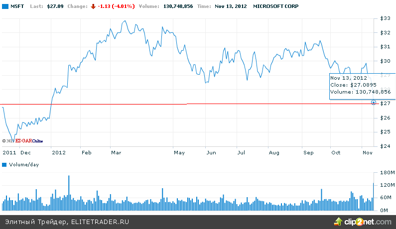 В отраслевом разрезе отметим, что отскок состоялся после нескольких дней падения в коммунальном секторе, тогда как в абсолютных аутсайдерах остался сектор высоких технологий, потерявший по индексу S&P 500 Information Technology 0,78%, в том числе благодаря 4%-ому провалу в акциях Microsoft на фоне неожиданного увольнения главы подразделения Windows Стивена Синофски, которому прочили место приемника генерального директора корпорации Стива Балмера. Обязанности Синофски перейдут к вице-президенту корпорации Джулии Ларсон-Грин.