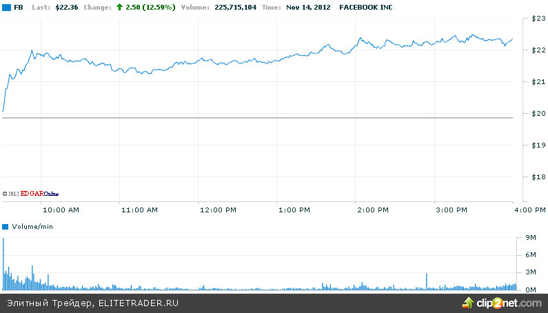 Среди отдельных историй наблюдавшихся вчера на Wall Street, отметим, резкий рост в акциях Facebook. Ранее инвесторы, напротив, справедливо полагали, что бумага будет под давлением ввиду очередного снятия моратория на продажу крупного пакета акций в объеме примерно 800 млн. бумаг. Цена с открытия устремилась вверх, подскочив в итоге на 12,59% на очень крупных объемах. Тот факт, что крупные покупки проходили непосредственно с первых минут сессии несколько обнадеживает в плане дальнейших перспектив, не смотря на все объективные причины для отказа от владения данными акциями.