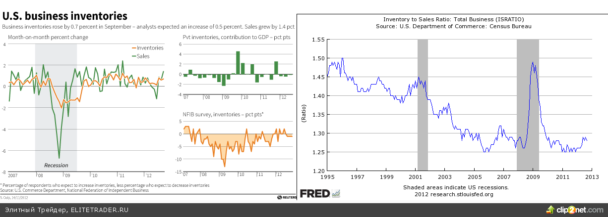 Объем запасов на складах вырос в сентябре на 0,7% до $1,613 трлн., превысив консенсус прогноз предполагавший рост на 0,5%. Продажи подскочили на 1,4% до $1,263 трлн. Запасоемкость - показатель, отражающий отношение величины запасов товарно-материальных ценностей к объему реализации продукции снизился с 1,29 до 1,28, указывая на рост спроса на продукцию, оставаясь при этом выше сентябрьского значения прошлого года составлявшего 1,25.