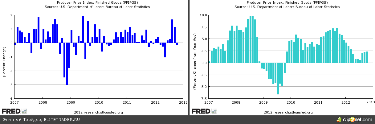 Индекс цен производителей неожиданно снизился на 0,2%, тогда как ожидался рост на ту же величину в месячном выражении. Октябрьское снижение связано с падением цен на энергоносители, которое составило 0,5%, в частности цены на бензин сократились на 2,2%, что как подчеркивает BLS контрастирует c ростом цен не продукты питания на 0,4%, наблюдающимся пятый месяц подряд. В то же время в годовом выражении рост составил 2,3%, против ожидавшихся 2,6%. Подобная тенденция по-прежнему позволяет ФРС маневрировать в своей монетарной политике, однако тревожит тот факт, что QE3 уже было объявлено и реализуется, а результат подобен представленному.