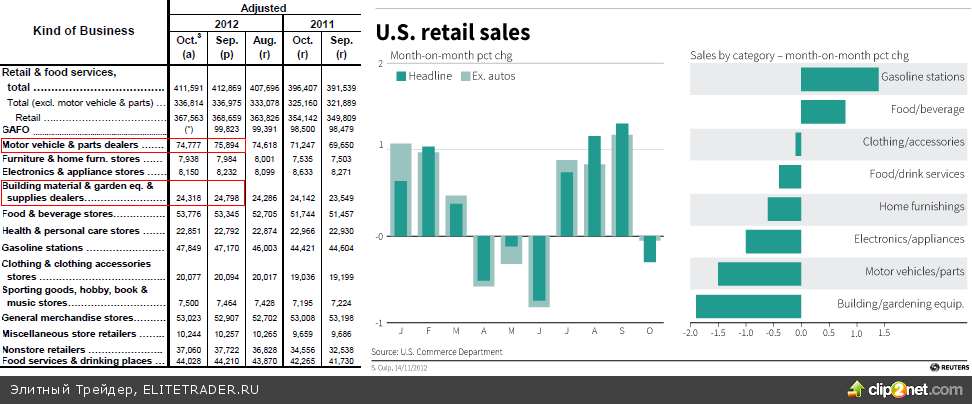 Так по данным Census Bureau объем розничных продаж в октябре сократился на 0,3% до $411,6 млрд. притом, что Минторг не смог собрать информацию из регионов в большей степени пострадавших от урагана Сэнди. Прогноз аналитиков предполагал более скромное сокращение на 0,2%. В то же время сентябрьские цифры были пересмотрены в сторону увеличения с 1,1% до 1,3%, а в годовом выражении в октябре рост составляет 3,8%. Наибольшее сокращение отмечается в подсекторе строительных материалов и садового оборудования (-1,9%) и продажах авто и запчастей (-1,5%).