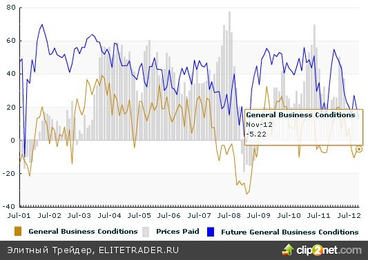 Индексы деловой активности ФРБ Нью-Йорка и Филадельфии показали разнонаправленную динамику в ноябре, в большей степени расстроило снижение последнего до -10,7 пункта, что также было обусловлено последствиями урагана Сэнди. Компании сообщили о небольшом снижении поставок, занятости и отработанных часов.