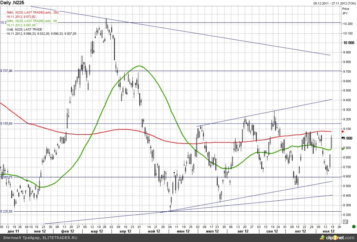 Азиатские фондовые индексы сегодня продолжают разнонаправленную динамику, при этом японский Nikkei вновь торгуется существенно лучше своих «коллег». Повод для позитива в стране восходящего солнца все тот же, что и вчера, это досрочные выборы в парламенте Японии, в результате которых, скорее всего, от власти отойдет непопулярная в последнее время Демократическая партия во главе с нынешним премьер - министром Есихико Нодой. Сегодня нижняя палата парламента приняла закон о дополнительных эмиссиях государственных ценных бумаг вплоть до 2015 года, для беспрепятственного принятия которого Нода и пошел на сделку с оппозицией и согласился на досрочные выборы, которые будут назначены на 16 декабря. Соответственно сегодня во второй половине дня нижняя палата парламента будет распущена. Если бы этот закон не был принят, то вскоре у государства бы закончились деньги для выполнения своих обязательств. Как ожидается, после 16 декабря к власти придет Либерально-демократическая партия во главе с Шинзо Эйби, который является ярым сторонником практически бесконтрольного ослабления денежно - кредитной политики. Благодаря этому японская йена сегодня второй день подряд продолжает свое ослабление, и пара USD/JPY уже торгуется на уровне 81,1.