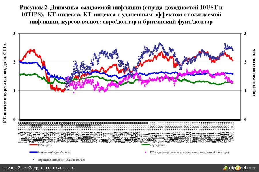 На рис. 2 представлена динамика рыночных инфляционных ожиданий, посчитанная как спрэд доходностей 10-летних обычных (10UST) и 10-летних защищенных от инфляции (10TIPS) казначейских облигаций США. Видно, что практически весь посткризисный период КТ-индекс следует за этой динамикой. Зависимость КТ-индекса от ожидаемой инфляции носит характер линейной регрессии (рис.3), что позволяет методом частных корреляций очистить КТ-индекс от влияния инфляционных ожиданий, а значит – изменений денежной массы (см. рис.2).