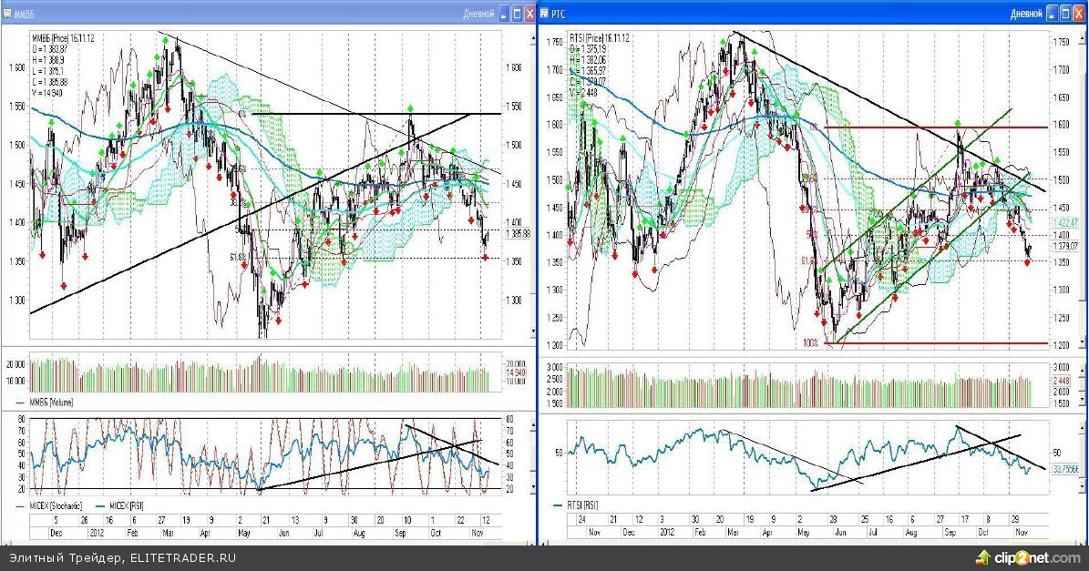 Надо отметить тот факт, что пока индексы торгуются над своими 61,8% уровнями Фибоначчи снижение, начатое в середине сентября, стоит пока рассматривать как коррекцию к предыдущему росту. Однако если падут отметки 1356,24 пунктов по индексу ММВБ и 1351,16 пунктов по индексу РТС, снижение примет форму самостоятельного движения