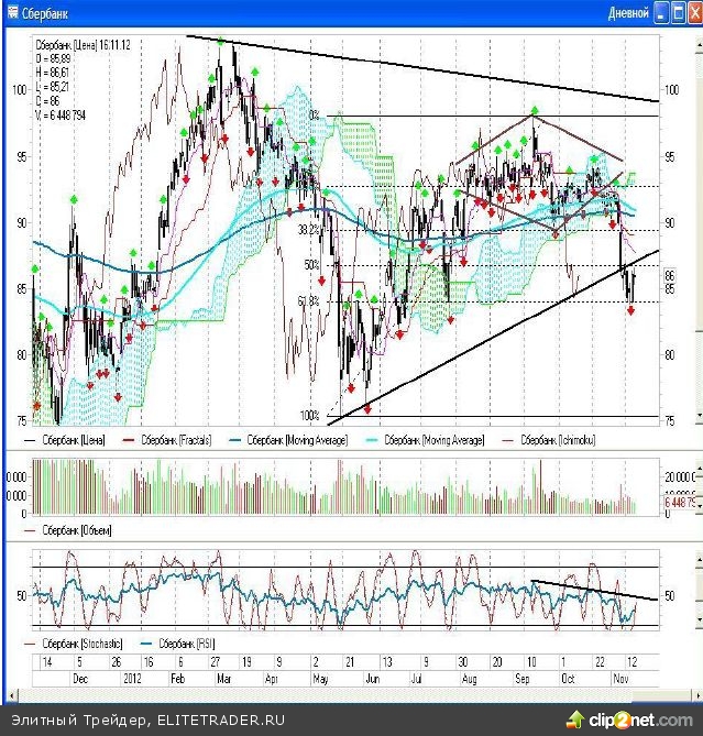И считаю, что отскок, который мы наблюдаем в этих бумагах, явление временное. Усиление снижения будет наблюдаться по факту пробоя ближайших фракталов на продажу: 83,75 и 83,01 рублей, а также в случае закрытия дня ниже 61,8% уровня Фибоначчи от роста 18.05-14.09, который находится на отметке 84,005 рублей.